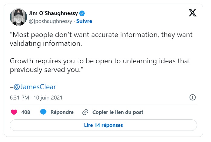 Réaliser que la plupart du temps le réflexe est de chercher des informations validantes plutôt qu’exactes. Un état d’esprit en croissance (Growth Mindset) oblige parfois à faire l’effort de désapprendre des idées qui vous ont longtemps servi.